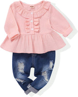 Little Girl Kid Outfit Toddler Jeans Ruffle Long Sleeve Shirt Tops + Floral Denim Jean Long Pant 2 Piece Fall Winter Clothes Sets(Yellow, 3-4T)